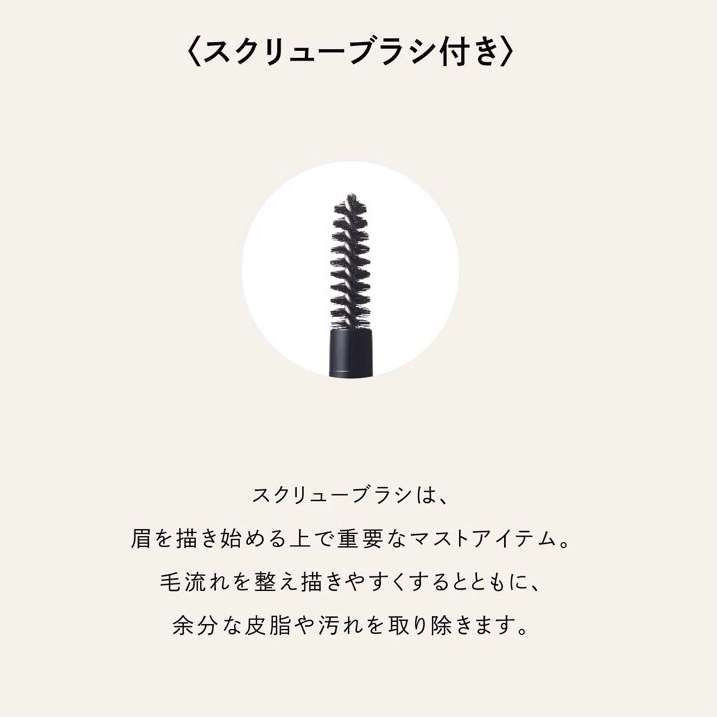 眉メイクにマストなスクリューブラシ付き。 毛流れを整えて描きやすく、描いたところをぼかす際に使用します。