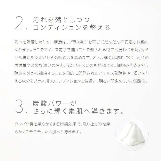 ふわふわのきめ細かな炭酸泡が、毛穴汚れや古い角質をやさしくオフ。