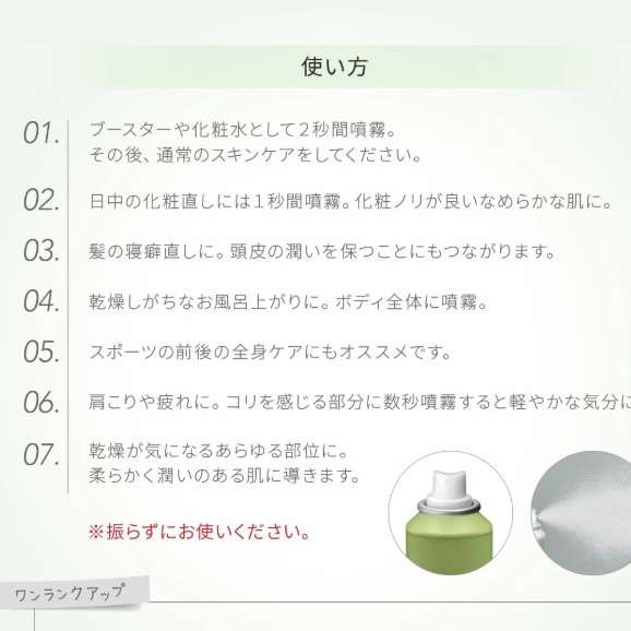 ブースターや化粧水として2秒間噴射。その後通常のスキンケアをしてください。